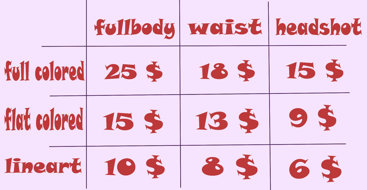 1. I will draw everything (including nsfw) besides metcha and too complex design. I can draw simple backgrounds without charge. I will not do something I`m not comfortable with.
